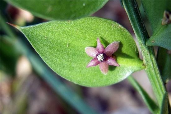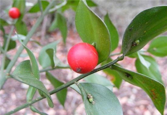 Cứ vào đầu mùa xuân, từ những phiến lá của cây đậu chổi butcher lại mọc ra những bông hoa xanh trắng nhỏ. Những bông hoa sẽ phát triển thành quả đỏ mọng vào mùa thu. Những quả đỏ nhỏ xíu được gắn trực tiếp lên lá cây trông rất kỳ lạ.