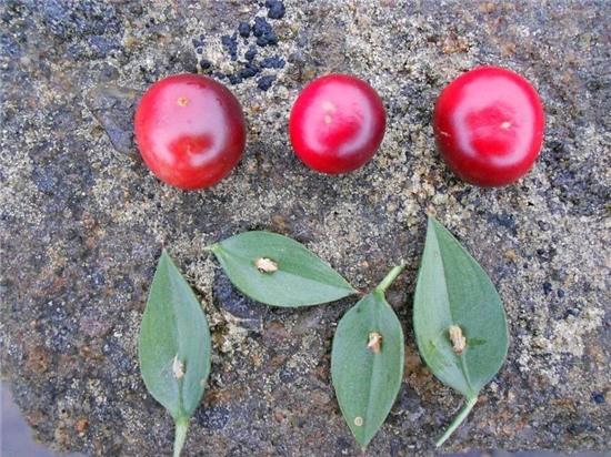 Phần quả đỏ mọng được gắn liền với phần lá mỏng dẹt.