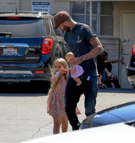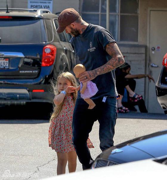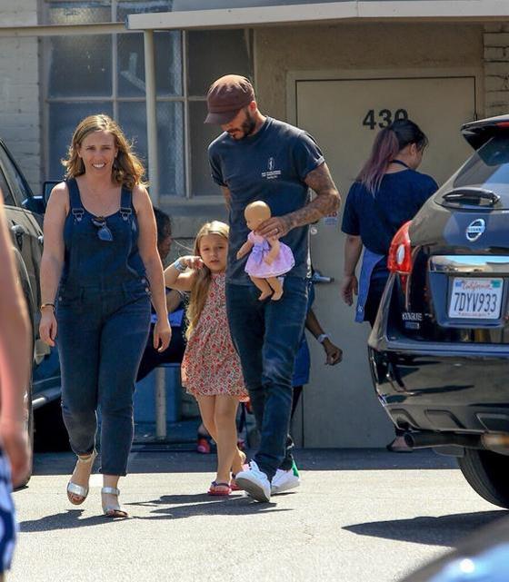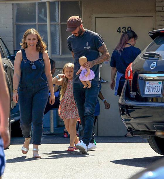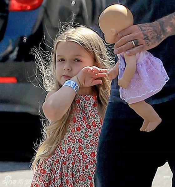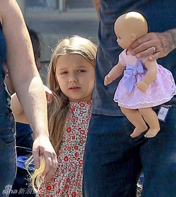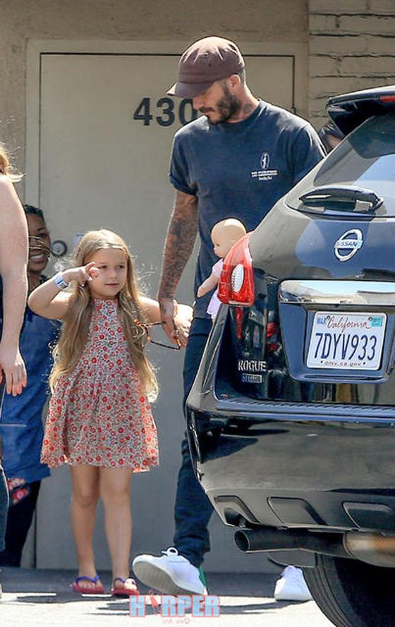 David Beckham nổi tiếng là ông bố cưng chiều con. Lần ra đường này, cựu tuyển thủ Anh không bế bé Harper trên tay mà thay vào đó, anh một tay dát con, một tay cầm búp bê cho cô bé.