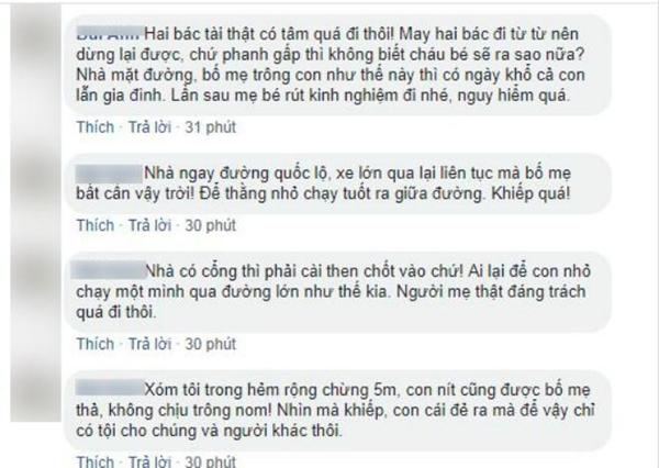 Bạn Hòa Bùi đồng quan điểm với Phú Tài và cho rằng: “Nhà có cổng thì phải cài then chốt thật chặt! Ai lại để con nhỏ chạy một mình qua đường lớn như thế kia. Người mẹ thật đáng trách quá đi thôi”.