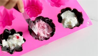 ![]() | ![]() Cho nhân kem vào giữa khuôn. Tiếp tục cho vào ngăn đông 15 phút. |