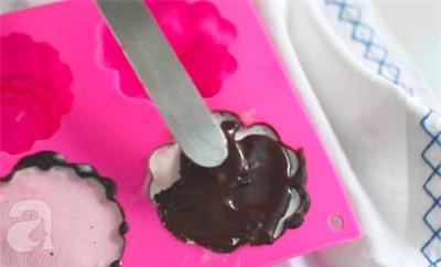 ![]() | ![]() Phủ chocolate lên khắp khuôn. Giữ trong ngăn mát 30 phút để lớp vỏ chocolate cứng lại. |