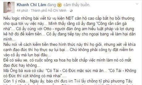 Chia sẻ gây bão của Lâm Khi Khanh: "Nếu logic những bài viết từ vụ kiện căn hộ cao cấp bắt họ bồi thường cho tới vụ việc này... Mình thấy rằng cô ấy đang "Cõng rắn cắn gà nhà"... Cô ấy cùng với Otto - người đàn ông am hiểu luật pháp và lợi dụng kẽ hở đó để kiếm tiền... Cô ấy đang tiếp tay cho ngoại bang về làm hại dân mình...
