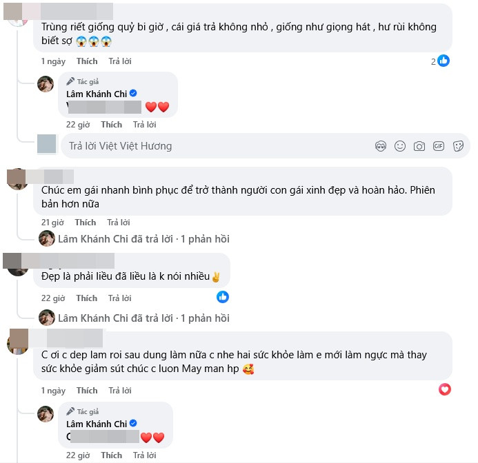 Nhiều người khuyên rằng nhan sắc hiện tại của Lâm Khánh Chi đã trẻ đẹp so với tuổi thực U50 rồi không cần can thiệp gì thêm. Số khác lại bình luận: "Trùng tu riết giống quỷ bây giờ, cái giá trả không nhỏ, giống như giọng hát, hư rùi không biết sợ." Tuy nhiên, Lâm Khánh Chi vẫn đáp lại nhẹ nhàng bằng icon hình trái tim.