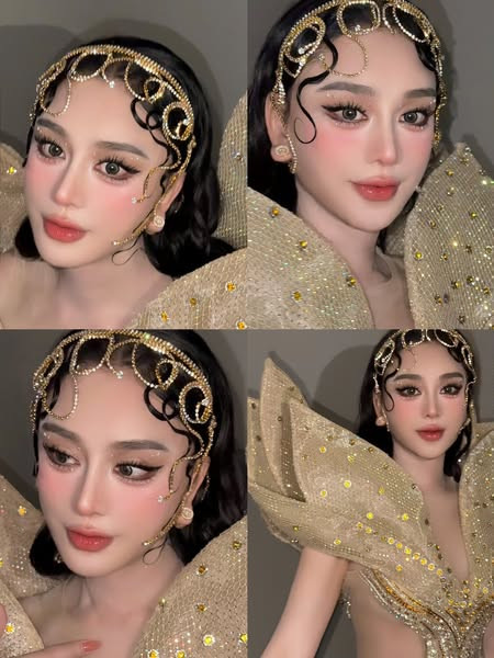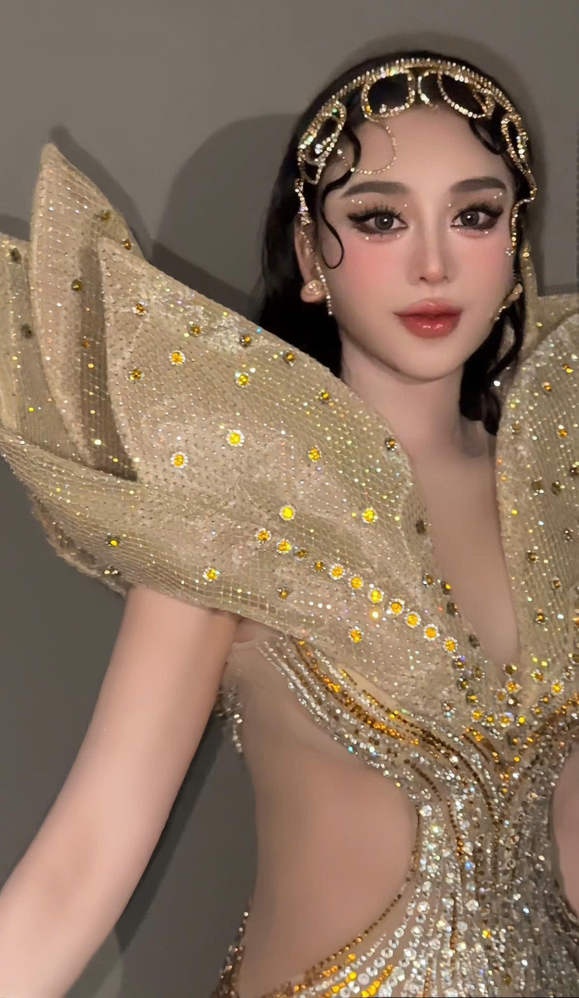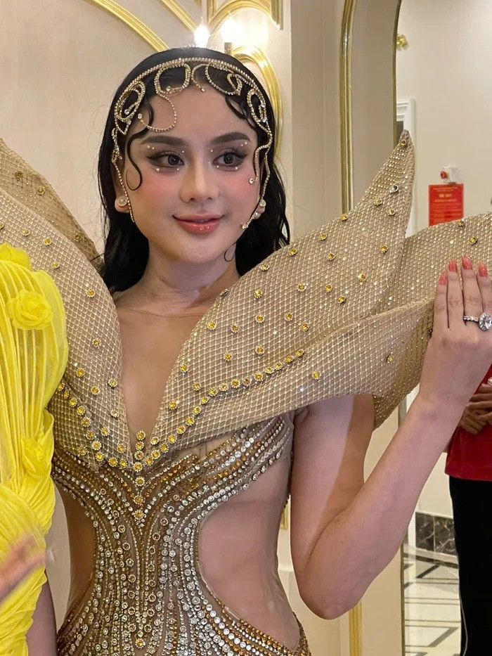 Lần này, người đẹp chuyển giới lựa chọn chiếc đầm màu vàng đính kết cầu kì với phần vai làm điểm nhấn, khá cồng kềnh. Lâm Khánh Chi tôn được vóc dáng thon thả. Phần tóc được tạo kiểu khá cầu kì cùng lớp trang điểm đậm sắc sảo.