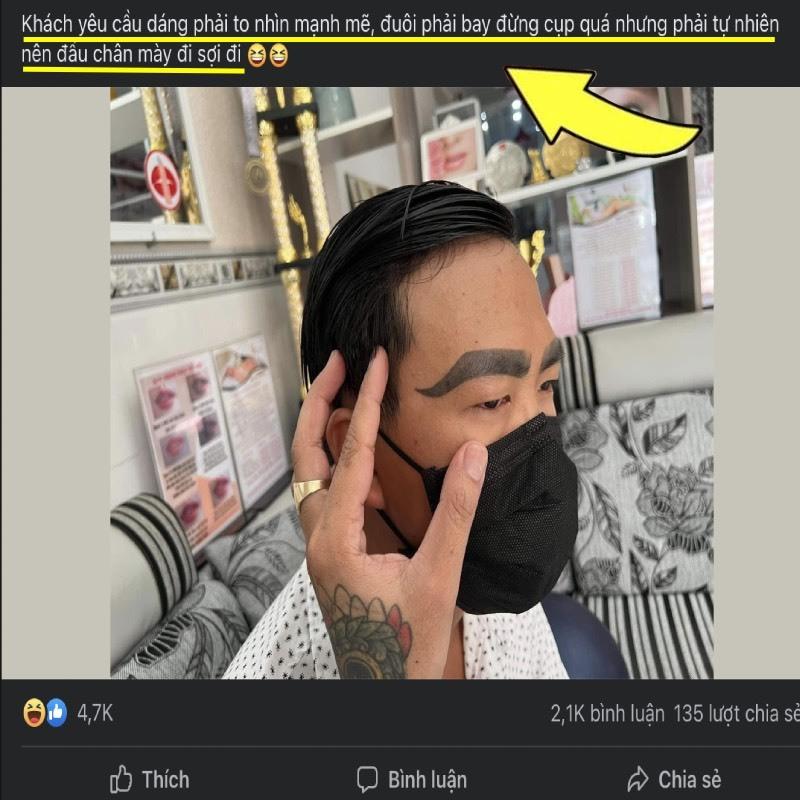 Theo đó, dân mạng đang lan truyền bài đăng về một người đàn ông. Kèm theo ảnh, chủ nhân post tâm sự: "Khách yêu cầu dáng lông mày phải to nhìn mạnh mẽ, đuôi bay đừng cụp quá nhưng phải tự nhiên nên đầu chân mày phải như thế này”.