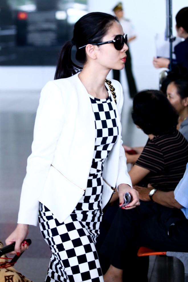 Bay từ Bắc Mỹ về Việt Nam mất hơn 10 tiếng đồng hồ nhưng Lệ Quyên tỏ ra không hề mệt mỏi. Cô diện chiếc đầm kẻ caro đen trắng và khoác ngoài một chiếc áo vest mỏng rất sành điệu.