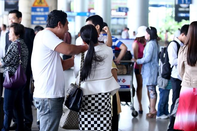 Ông xã của nữ ca sĩ lặng lẽ đi sau vợ với chiếc xe đẩy chất đầy hành lý của hai vợ chồng. Bởi chuyến lưu diễn dài tới 2 tuần và đi qua nhiều địa điểm nên vợ chồng Lệ Quyên mang theo khá nhiều hành lý.