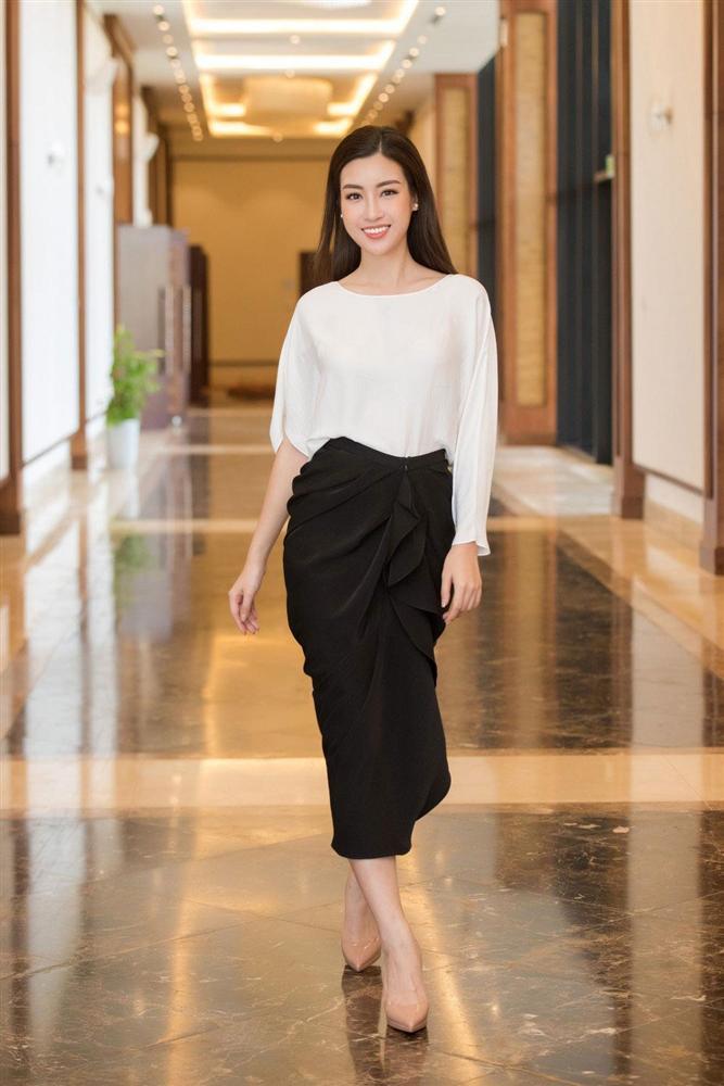 Hoa hậu Đỗ Mỹ Linh luôn được đánh giá là nàng ngọc nữ của Vbiz. Mỗi lần xuất hiện tại sự kiện, người đẹp luôn ăn mặc đơn giản, thanh lịch đúng mực giống như chiếc váy nửa trắng nửa đen ấn tượng này.