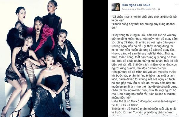 Lan Khuê cho rằng Phạm Hương sợ Quỳnh Mai, sợ team Hồ Ngọc Hà mà năm lần bảy lượt chỉ loại team của cô mà không loại bất cứ thí sinh nào trong team Hà Hồ. Đáp trả lại Lan Khuê, Phạm Hương lấy lí do rằng mình đang tạo cơ hội cho những người trẻ hơn chứ không phải là người tàn nhẫn chỉ trực chờ để loại team Lan Khuê.
