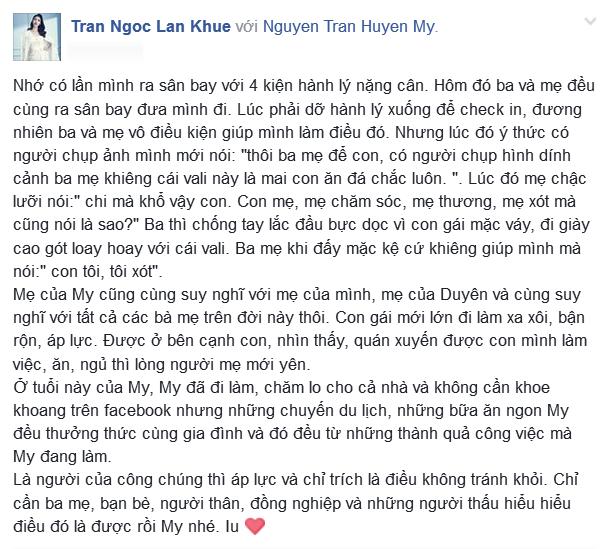 Trong khi Huyền My đang phải đối mặt với luồng dư luận trái chiều, Lan Khuê bất ngờ lên tiếng bảo vệ đàn em thông qua dòng trạng thái mới nhất trên trang cá nhân. Theo cách nhìn của siêu mẫu, việc đẩy hành lý giúp con gái là hành động bình thường của những bậc phụ huynh tại sân bay. Bản thân Lan Khuê cũng tiết lộ, cô từng được bố mẹ giúp dỡ bốn kiện hành lý để mình có thể dễ dàng di chuyển tại sân bay khi đang mặc váy dài và đi giày cao gót.