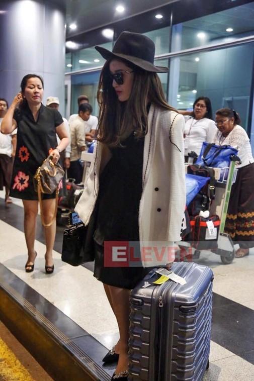 Hình ảnh mẹ Huyền My lẽo đẽo xách vali hành lý theo sau con gái tại sân bay Myanmar.