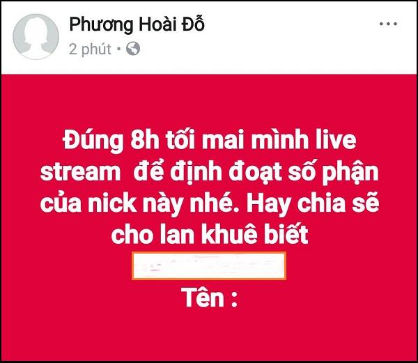 Người này thông báo sẽ livestream để định đoạt số phận Facebook của Lan Khuê.