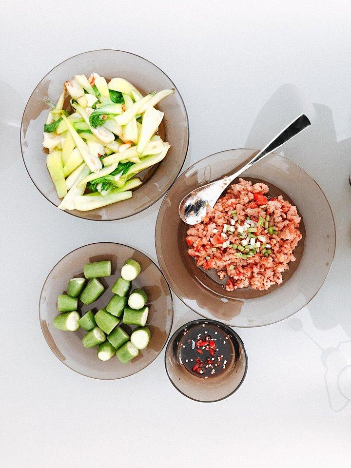 Meow vào bếp với cá hồi rim nước tương cùng rau rền luộc và dưa leo