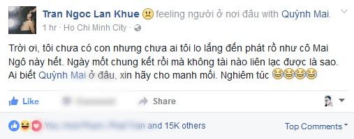 "Trời ơi, tôi chưa có con nhưng chưa ai tôi lo lắng đến phát rồ như cô Mai Ngô này hết. Ngày mốt chung kết rồi mà không tài nào liên lạc được là sao. Ai biết Quỳnh Mai ở đâu, xin hãy cho manh mối. Nghiêm túc."