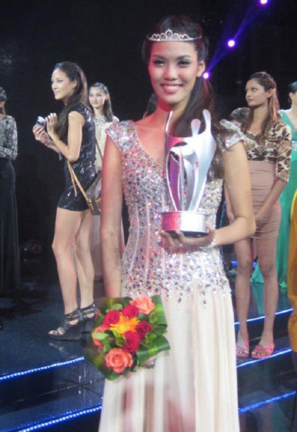 Lan Khuê khoe chứng nhận giải thưởng của cuộc thi Siêu mẫu Châu Á 2012. Tuy gương
