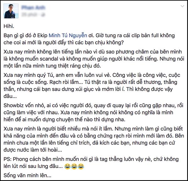 Trước hành động tố cáo của thành viên trong ê-kip Minh Tú, quản lý của Lan Khuê đã đăng đàn đáp trả. Người này còn "tag" hẳn tên Minh Tú vào trong chia sẻ của mình để "ba mặt một lời".