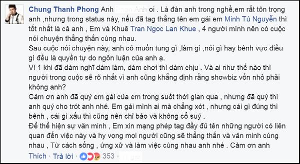 Tuy nhiên, Chung Thanh Phong lại cho rằng ý kiến của Lan Khuê là không cần thiết. "Chẳng có nghĩa vụ hay hợp đồng ràng buộc gì để gặp nhau xử lý công việc. Chỉ cần 4 người anh nghĩ là đủ rồi", họ Chung nhắn nhủ.