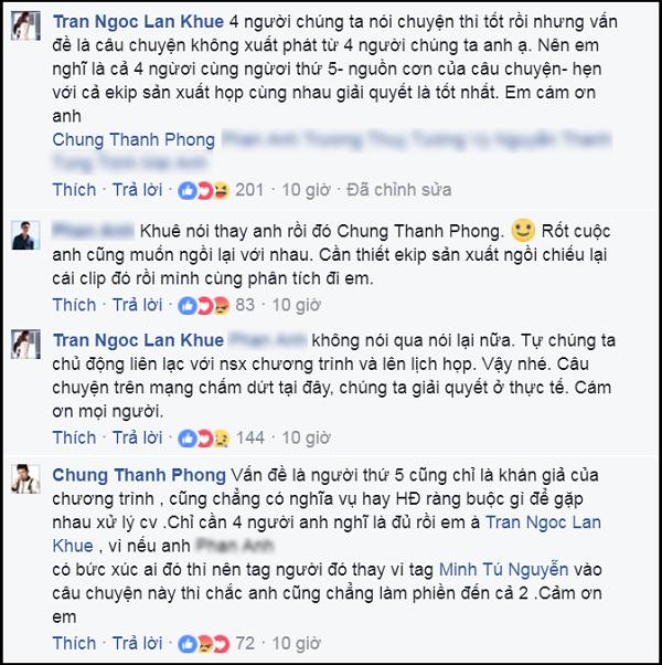 Tuy nhiên, Chung Thanh Phong lại cho rằng ý kiến của Lan Khuê là không cần thiết. "Chẳng có nghĩa vụ hay hợp đồng ràng buộc gì để gặp nhau xử lý công việc. Chỉ cần 4 người anh nghĩ là đủ rồi", họ Chung nhắn nhủ.
