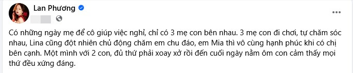 Mới đây, trên trang cá nhân, Lan Phương chia sẻ clip vui chơi cùng các con. Cô viết: "Có những ngày mẹ để cô giúp việc nghỉ, chỉ có 3 mẹ con bên nhau. 3 mẹ con đi chơi, tự chăm sóc nhau, Lina cũng đột nhiên chủ động chăm em chu đáo, em Mia thì vô cùng hạnh phúc khi có chị bên cạnh. Một mình với 2 con, đủ thứ phải xoay xở rồi đến cuối ngày nằm ôm con cảm thấy mọi thứ đều xứng đáng."