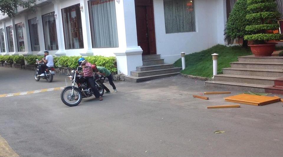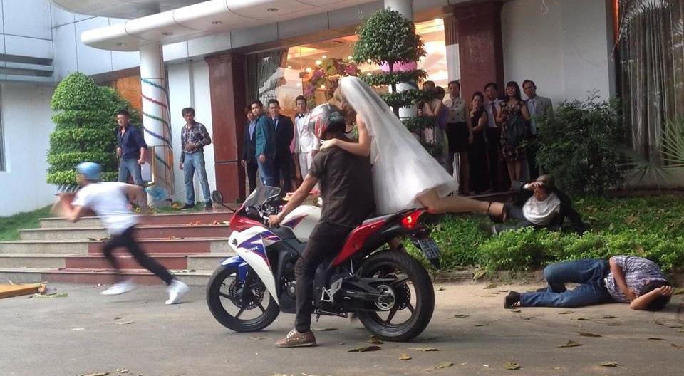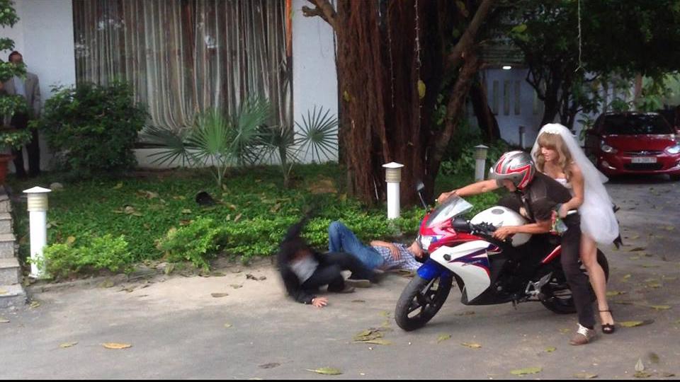Kết thúc màn ẩu đã là đồ vật bị đập phá ngổn ngang và cô dâu lên mô tô chạy trốn