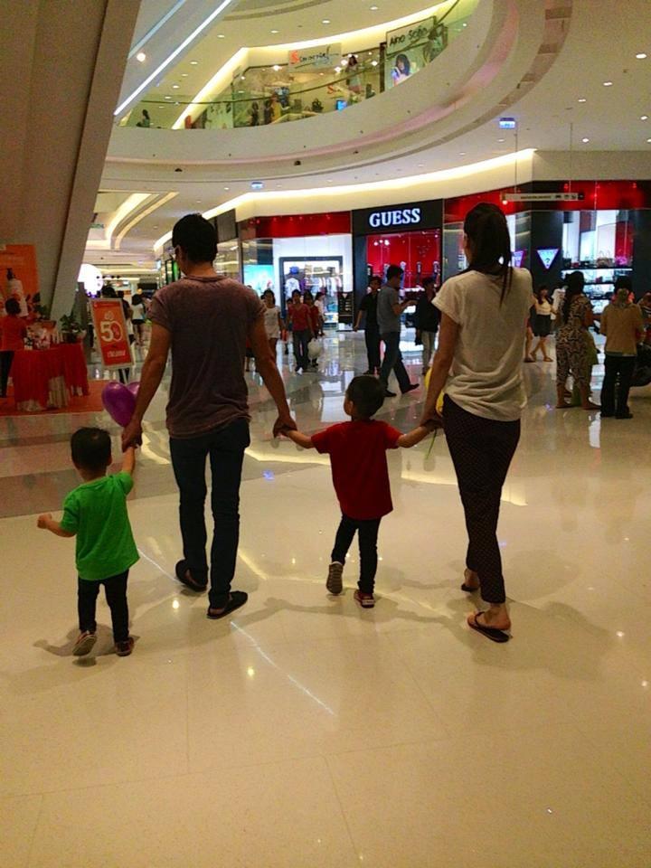 cùng đôi tông bệt dắt tay con trai đi chơi.