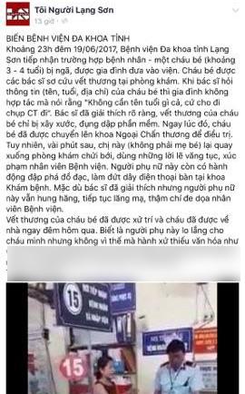 Thông tin từ chủ nhân đăng tải sự việc cho biết; sự việc diễn ra vào khoảng 23h đêm 19/6, một cháu bé khoảng 3-4 tuổi bị ngã, được gia đình đưa đến bệnh viện đa khoa tỉnh Lạng Sơn để cấp cứu.