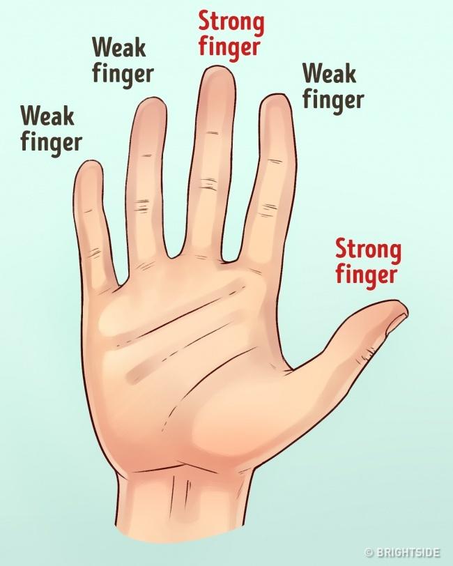 Ngón tay hơi cong, nghiêng thì đó là ngón tay yếu. Còn nếu là một ngón dài, thẳng thì đó là ngón mạnh (Ảnh: brightside)