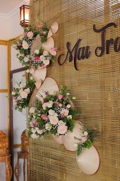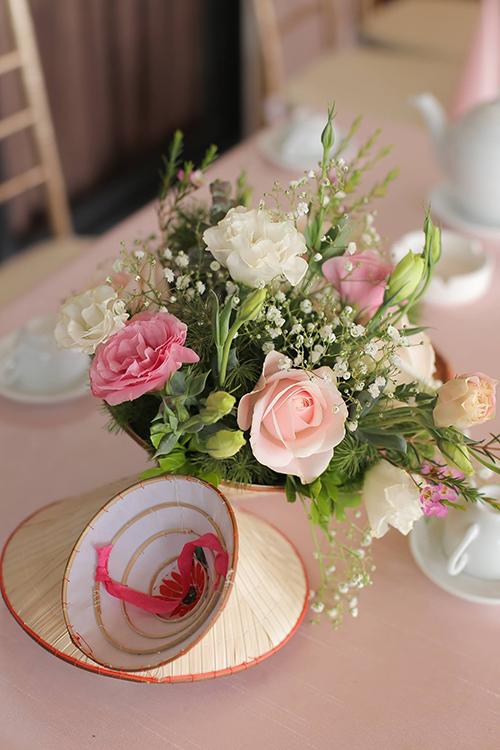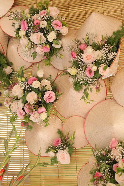 Nón lá đủ kích thước được đặt xen kẽ với hoa tươi tạo điểm nhấn độc đáo cho buổi lễ.