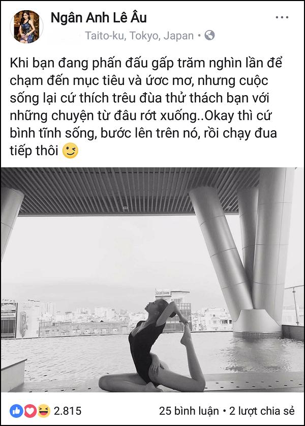 Đêm 24/4 từ Nhật Bản, chân dài họ Lê cập nhật dòng trạng thái đầy ẩn ý: "Khi bạn đang phấn đấu gấp trăm nghìn lần để chạm đến mục tiêu và ước mơ nhưng cuộc sống lại cứ thích trêu đùa thử thách bạn với những chuyện từ đâu rớt xuống. Okay thì cứ bình tĩnh sống, bước lên trên nó, rồi chạy đua tiếp thôi".