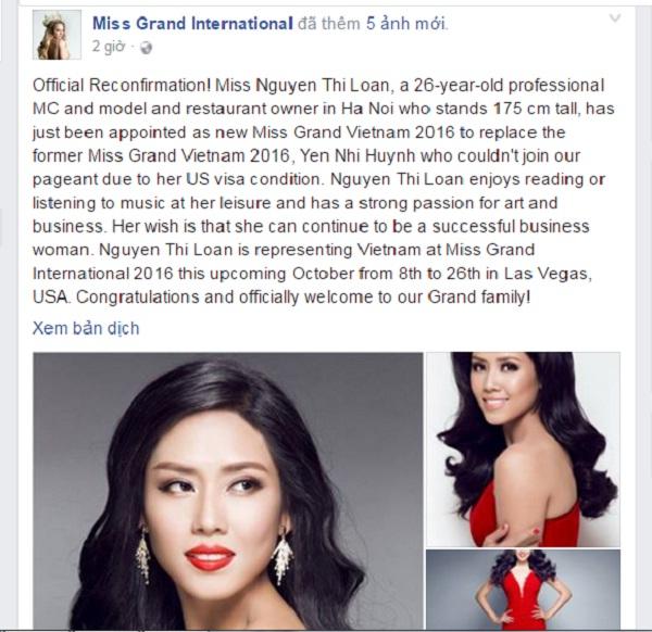 Trang chủ Miss Grand Internationnal và Nguyễn Thị Loan đều xác nhận thông tin này.