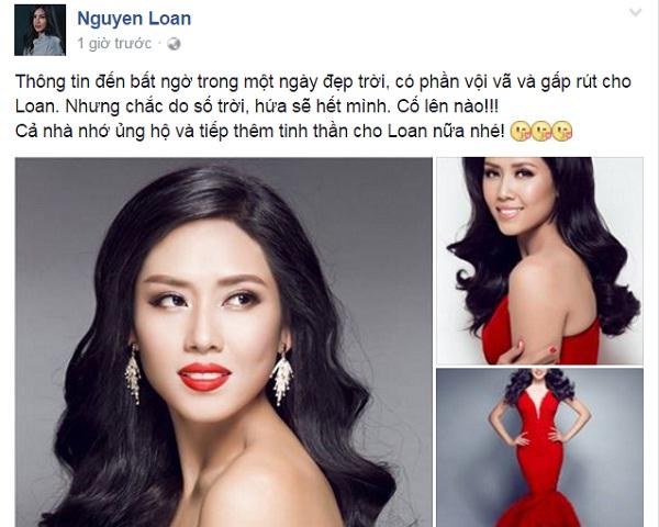 Thế nhưng, Nguyễn Thị Loan bất ngờ lên tiếng phủ nhận phát ngôn của Lệ Hằng ngay sau đó. Nguyễn Thị Loan tiết lộ cô và Lệ Hằng là "đối thủ" của nhau, cùng tranh tấm vé dự thi Miss Universe 2016, và đơn vị giữ bản quyền đang cân nhắc nhiều yếu tố để chọn một trong hai.