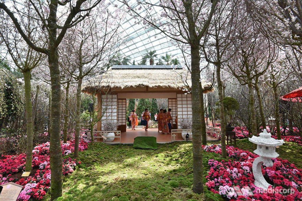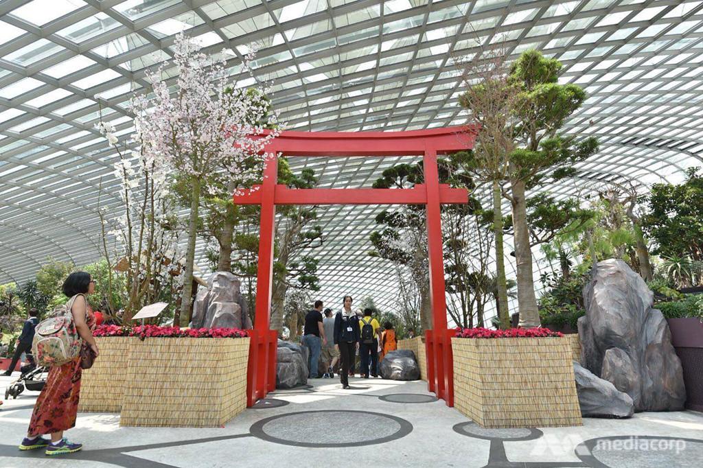 Du khách vào Flower Dome sẽ được chào đón bằng một cổng Tori và những cây anh đào được đưa đến từ Nhật Bản.
