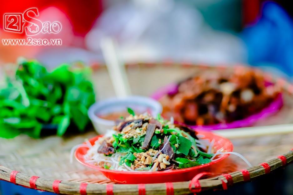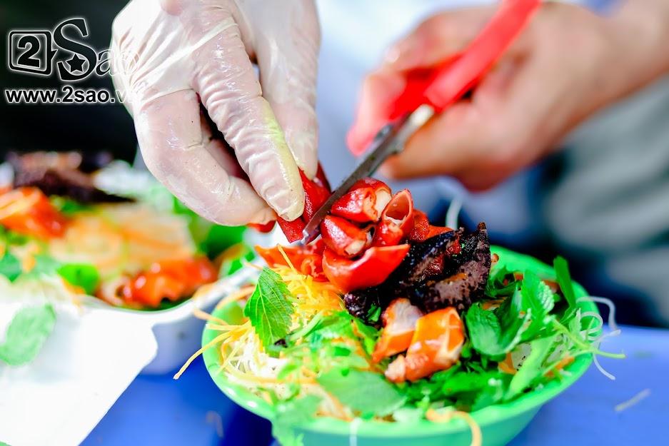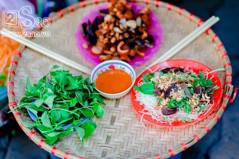 Ngoài các nguyên liệu quen thuộc: đu đủ xanh nạo sợi, thịt bò khô, lạc rang giã dập, các loại rau gia vị, nộm ở quán có tuổi đời hơn 20 năm này còn thêm cả bì lợn thái sợi trộn thính nếp khá lạ miệng.