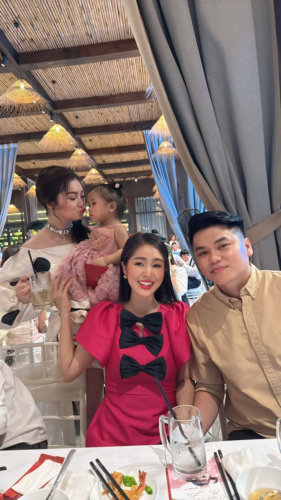 Tham dự tiệc thôi nôi, Lê Phương cùng con gái bé Bông vô cùng nổi bật khi diện đồ đôi váy hồng đính nơ đen trước ngực.