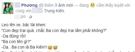Cách đây ít giờ, Lê Phương chia sẻ niềm hạnh phúc khi chứng kiến con trai dành nhiều quan tâm yêu mến tới bạn trai mới của mẹ. Theo đó, nữ diễn viên sinh năm 1985 đăng tải đoạn hội thoại của quý tử với người tài xế chở hai mẹ con.
