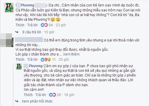 Không để mọi người tranh luận lớn tiếng về câu chuyện của mình, nữ diễn viên sinh năm 1985 hồi đáp: "Phương chưa bao giờ phủ nhận nguồn gốc. Sự thật là con trẻ sẽ yêu quý những ai gần gũi yêu thương, cho bé cảm giác an toàn. Chỉ sai là những lời góp ý phiến diện và áp đặt, nhìn nhận sự việc không khách quan và thấu đáo. Lời giãi bày chân thành của Phương dành cho bạn. Xin cảm ơn".