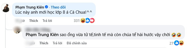 Tuy nhiên, điều khiến cư dân mạng thích thú hơn cả lại đến từ màn tương tác giữa hai vợ chồng. Cụ thể, ông xã Trung Kiên bất ngờ để lại bình luận đầy hài hước: “Lúc này anh mới học lớp 8 á Cà Chua!”.