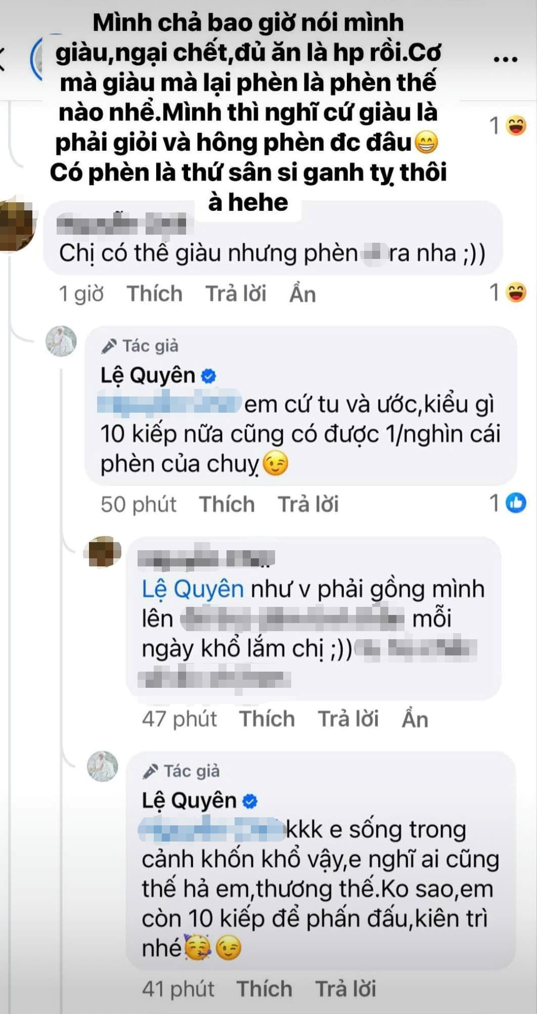 Khi antifan tiếp tục dùng lời lẽ đầy miệt thị, Lệ Quyên vẫn giữ nguyên sự bình tĩnh, nhưng không thiếu phần châm biếm: “Em sống trong cảnh khốn khổ vậy, em nghĩ ai cũng thế hả em, thương thế. Không sao, em còn 10 kiếp để phấn đấu, kiên trì nhé”.
