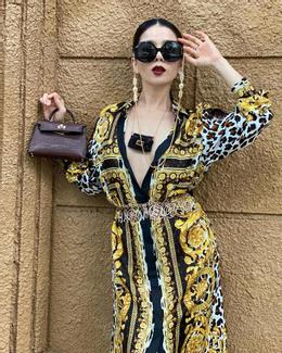 Set đồ Lệ Quyên chọn gồm toàn những item khá trendy như chiếc đầm cổ sơ mi của Versace, túi Hermès, thắt lưng Chanel, kính mắt, giày lưới và chiếc túi mini làm vòng cổ.