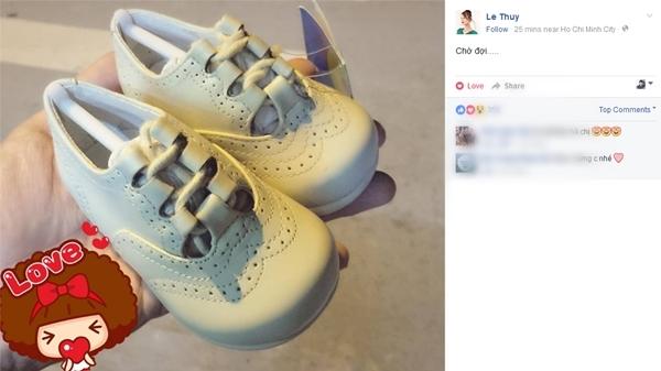 Cách đây ít phút, Lê Thúy đã đăng trên facebook cá nhân một đôi giày trẻ em khá xinh xắn với dòng nhắn nhủ: Chờ đợi...