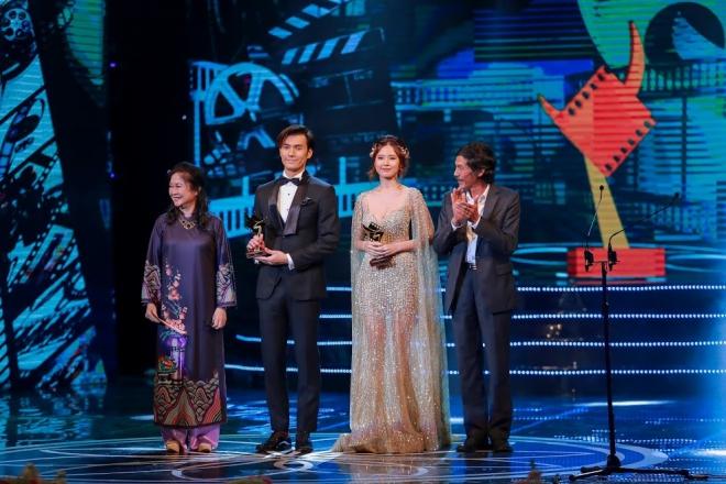 Nữ diễn viên Diệu Thuần trao giải cho Nhan Phúc Vinh sau sự cố đọc sai tên.