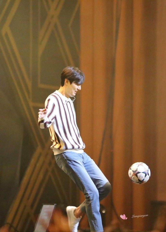 Lee Min Ho thể hiện kỹ năng đá bóng trên sân khấu. Anh chàng từng có ước mơ trở thành cầu thủ đá bóng