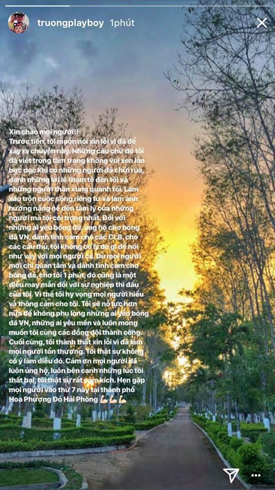 Vì thế tôi hy vọng mọi người hiểu và thông cảm cho tôi. Tôi sẽ nỗ lực hơn nữa để không phụ lòng những ai yêu bóng đá, những ai yêu mến và luôn mong muốn tôi cùng các đồng đội thành công. Cuối cùng, tôi thành thật xin lỗi vì đã làm mọi người tổn thương.