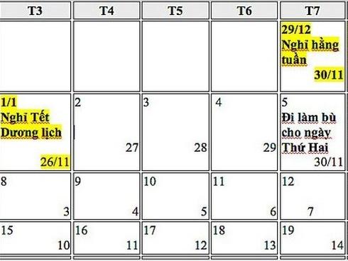 Điều khác biệt duy nhất trong 2 phương án trên là việc ấn định 5 ngày nghỉ Tết (theo quy định của Luật Lao động) rơi vào thứ tự ngày nào, với 4 ngày nghỉ còn lại là nghỉ cuối tuần liền kề hoặc nghỉ bù do trùng với ngày được ấn định nghỉ Tết.