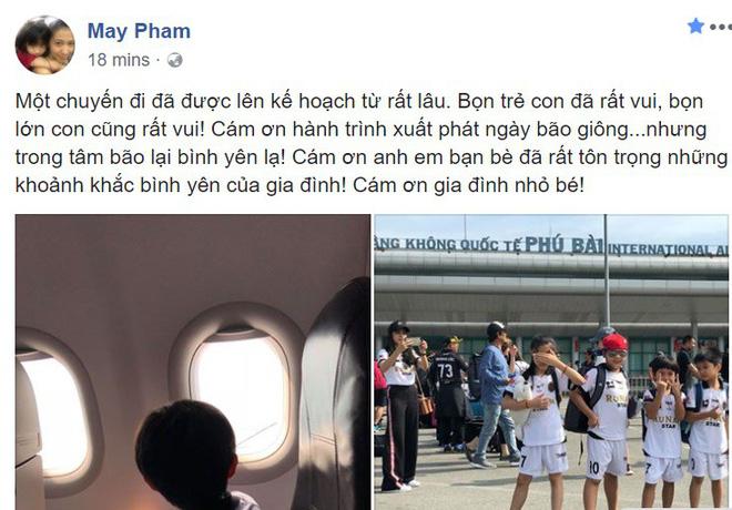 Đính kèm đó là hình ảnh hạnh phúc của các con cô khi được đi du hí. Đặc biệt trong dòng trạng thái mới đăng tải, nhiều người không khỏi nghi ngờ và cho rằng May Pham đang ẩn ý đến scandal của chồng khi viết: "Hành trình xuất phát ngày giông bão nhưng trong tâm bão lại bình yên lạ".