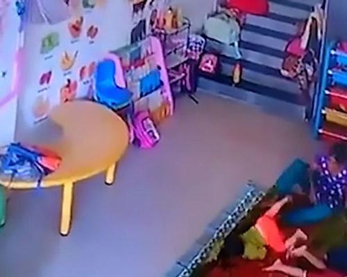 Camera giám sát của trường đã ghi lại cảnh nữ nhân viên trông trẻ nhấc đứa bé lên rồi ném mạnh xuống thảm. Clip được một phụ huynh đăng tải lên mạng khiến nhiều người bức xúc.