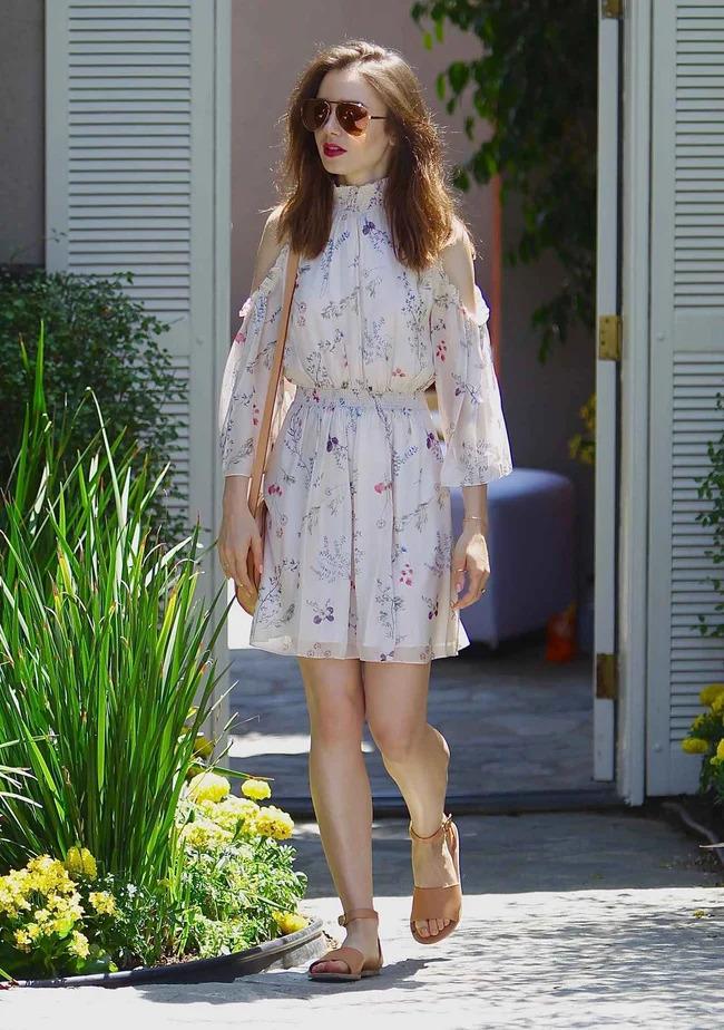 Mẫu váy hoa nhí khoét vai của Lily Collins trông rất xinh tươi và trẻ trung. Để không làm mất đi vẻ tinh tế và bay bổng, Lily Collins mix cùng một đôi sandal màu be và đeo túi xách ton-sur-ton.
