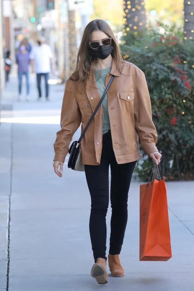 Combo áo thun + áo khoác da + quần jeans đen của Lily Collins là gợi ý thú vị cho những cô nàng cá tính. Sự kết hợp giữa gam màu xanh và nâu sữa đã tạo nên vẻ tao nhã, sang xịn cho tổng thể.