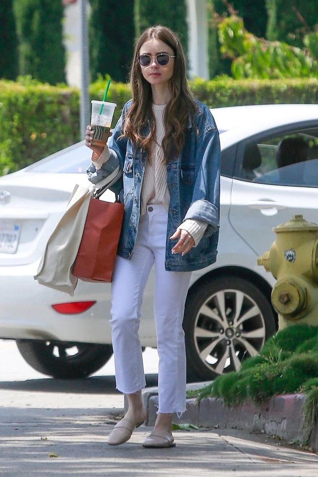 Lily Collins diện áo khoác denim vừa trẻ trung, vừa trang nhã, phối theo phong cách layer bên trong áo len kết hợp với quần jeans cắt gấu không thể chất hơn.